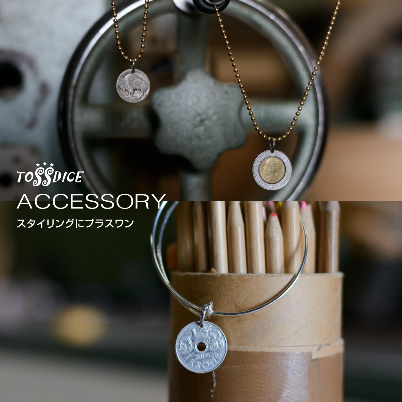 スタイリングをワンランクアップしてくれるアクセサリーアイテム。TOSSDICE では、周りと差のつく個性的なアクセサリーをご用意しております。