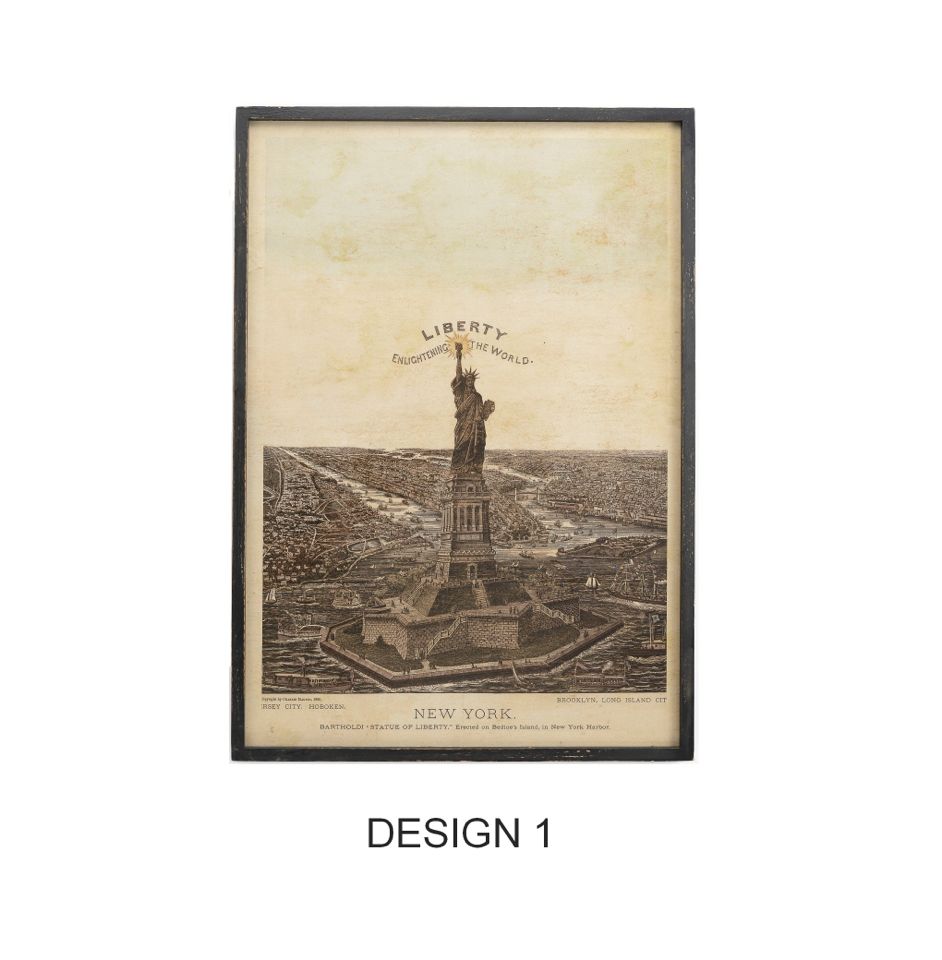 1885年アメリカ・ニューヨークで使用されていた自由の女神像をモチーフにしたポスターを、オリジナルのウッドフレームにおさめたウォールアートです。